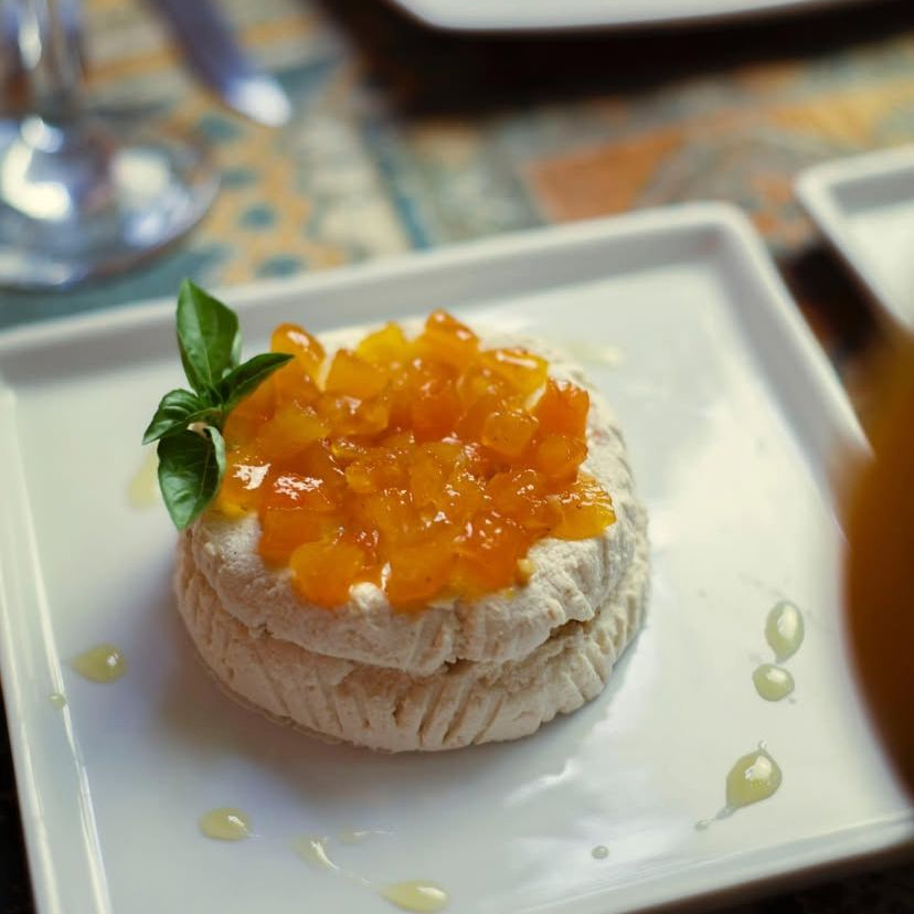 160g de queijo chancliche com recheio de nozes e cobertura de geleia de damasco. Acompanha pão sírio