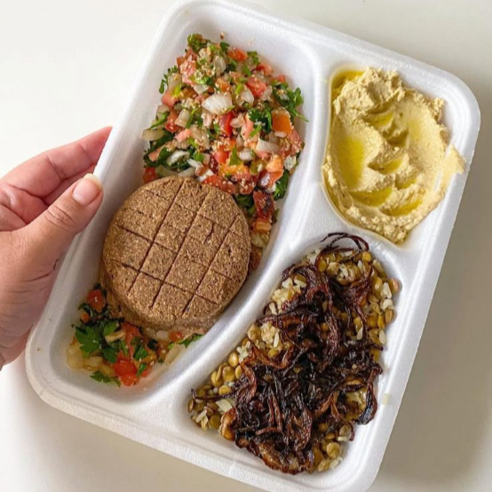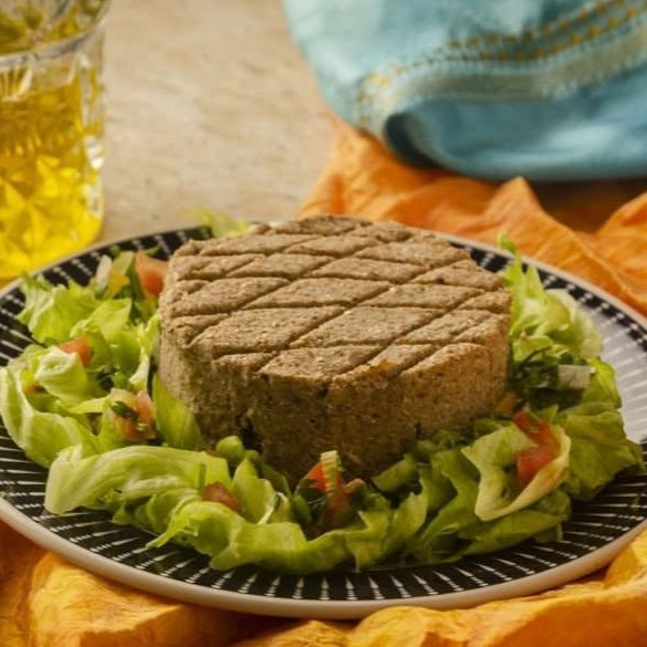 Kibe assado de ricota, arroz de lentilha, salada tabule e 80g homus tahine. Acompanha porção de pão sírio