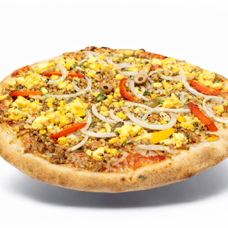Massa tradicional, molho de tomate, queijo de castanha de caju, cebola, milho, soja temperada, azeitonas e orégano.
