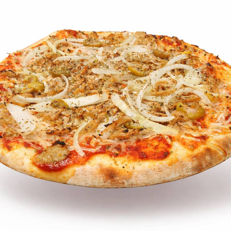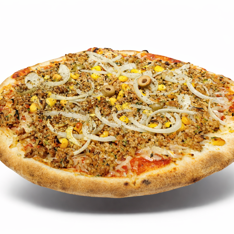 Massa tradicional, molho de tomate, queijo de castanha de caju, cebola, atum fake, azeitonas e orégano.