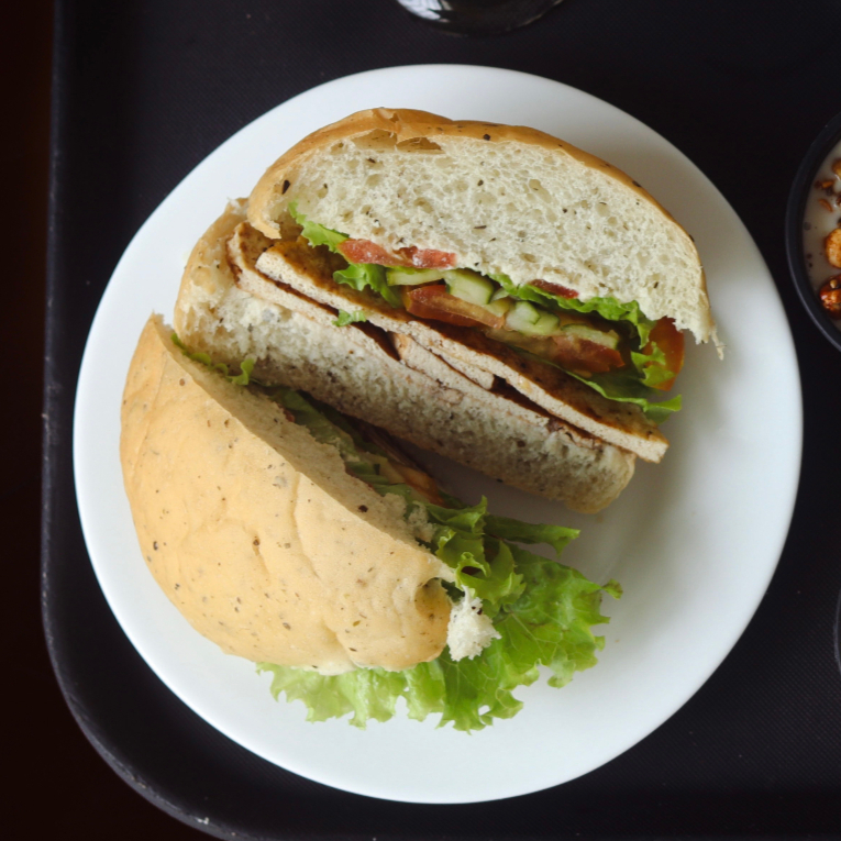 Fatias de tofu grelhado, alface, tomate, pepino e requeijão de castanhas no pão do dia.