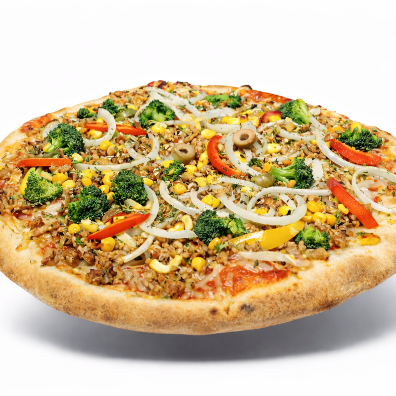 Massa tradicional, molho de totate, queijo de castanhas, milho, pimentão, cebola, brócolis, tomates, azeitonas e orégano