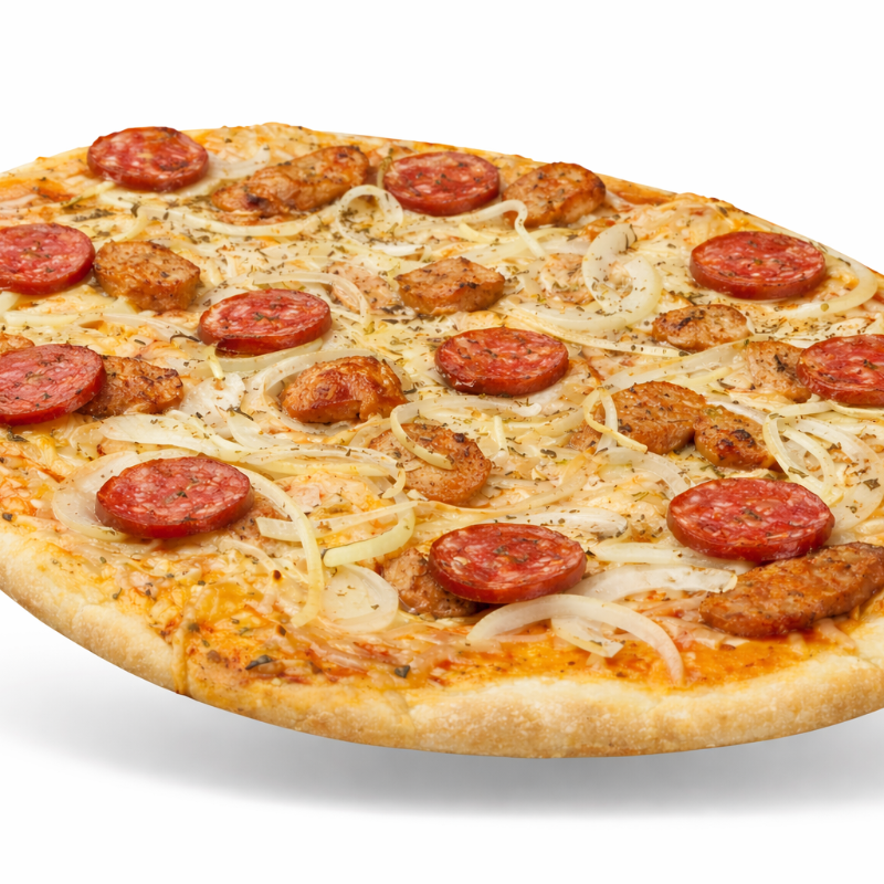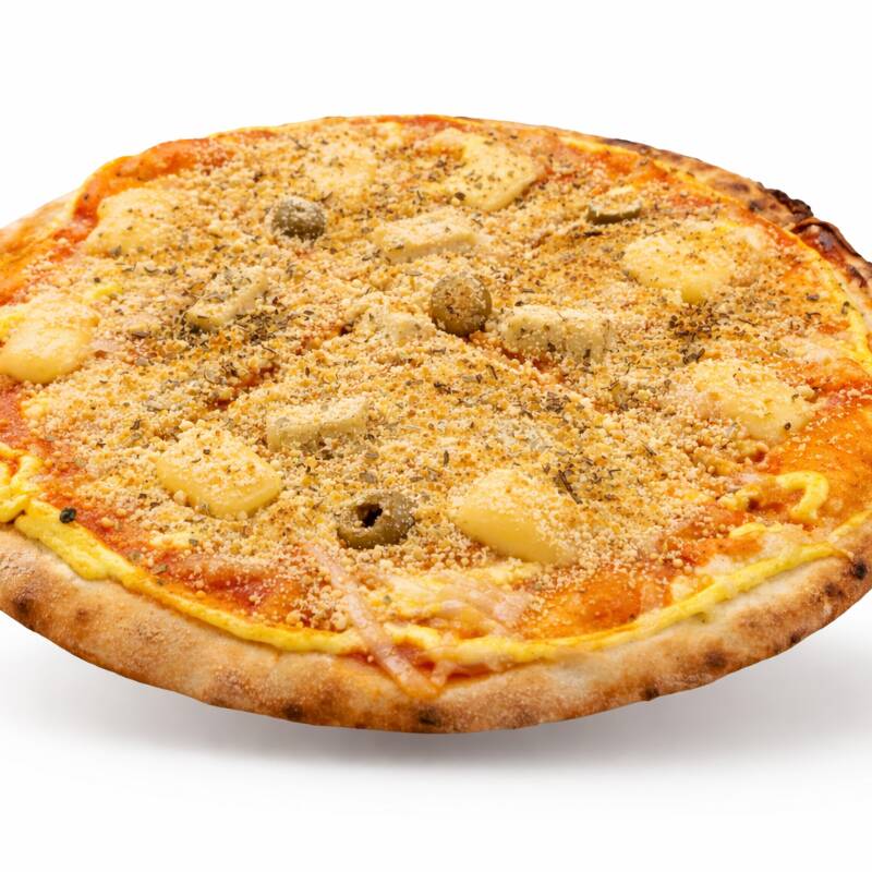 Massa tradicional, molho de tomate, queijo de castanhas, calabresa veg, cebolas, azeitanas e orégano.
