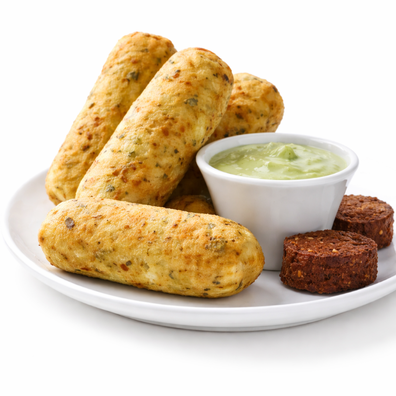 Bolinho de aipim, bolinhos de falafel ou anéis de cebola. Escolha o tipo de salgado e o molho.