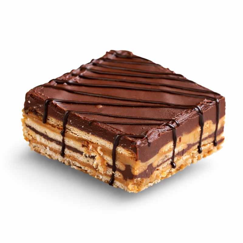 Camadas de doce de leite vegano, alternado com camadas de chocolate meio amargo e camadas de biscoito.