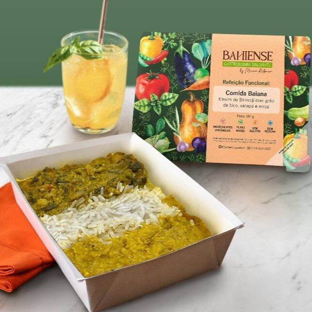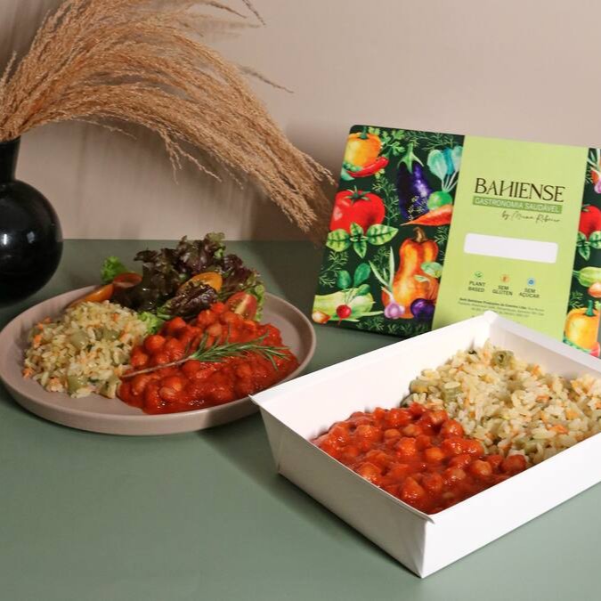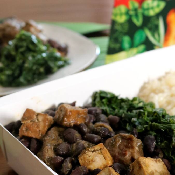 A tradicional feijoada baiana, o sabor envolvente e marcante, preparada com feijão preto, tofu defumado orgânico, carnes vegetais à base da proteína de ervilha, isca de soja marinada, arroz temperado e couve refogada.