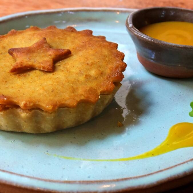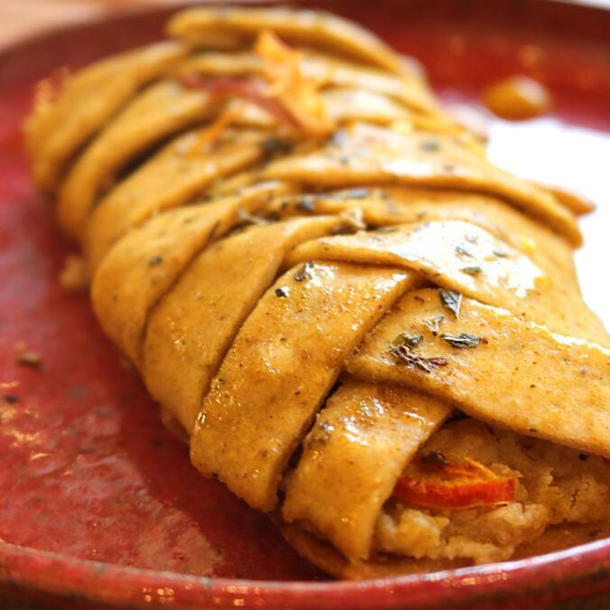 Massa de grão de bico, recheada com frango vegetal desfiado e creme de milho artesanal.