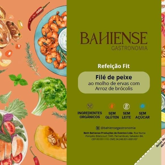Filé de peixe marinado, assado ao molho cremoso de ervas, acompanhado com arroz de brócolis salteado.