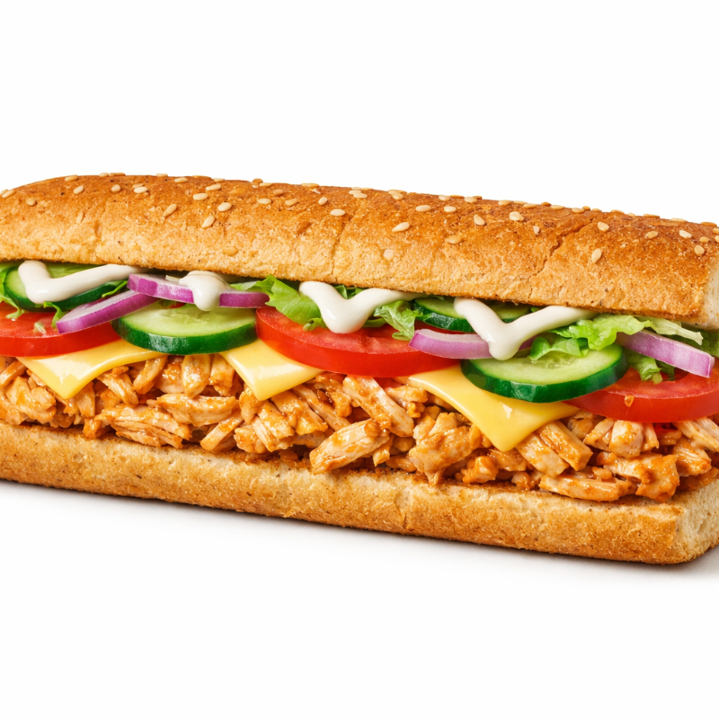 Pão 16 cm com parmesão e orégano, frango desfiado com cream cheese.