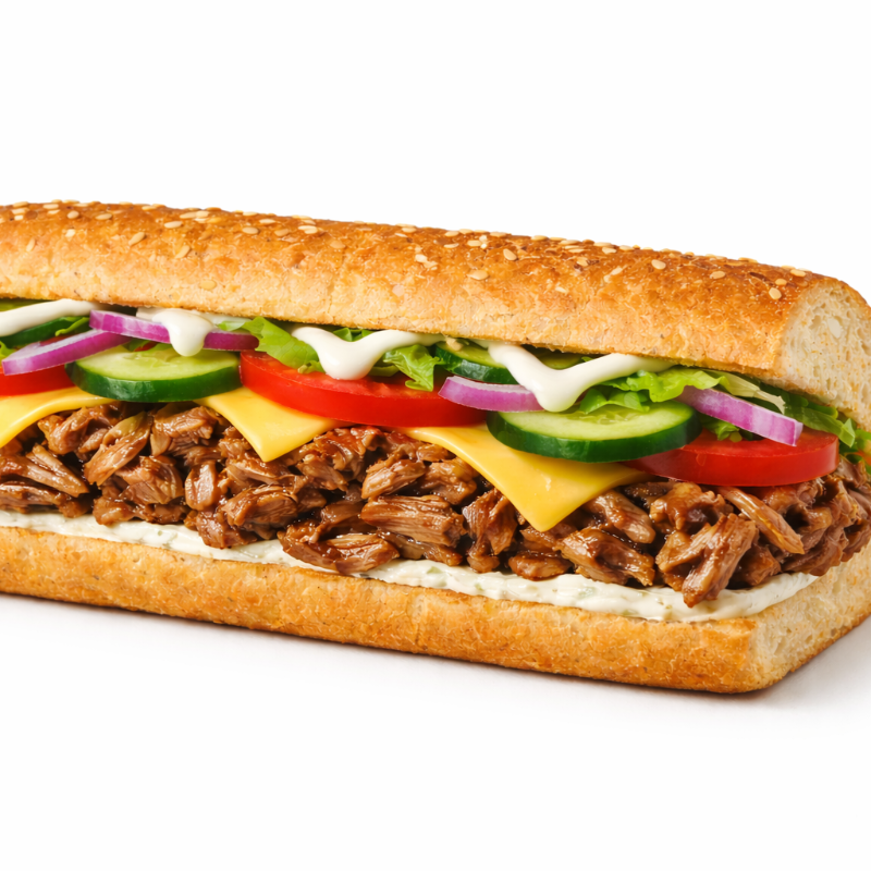 Pão 16 cm com parmesão e orégano, carne louca temperada.