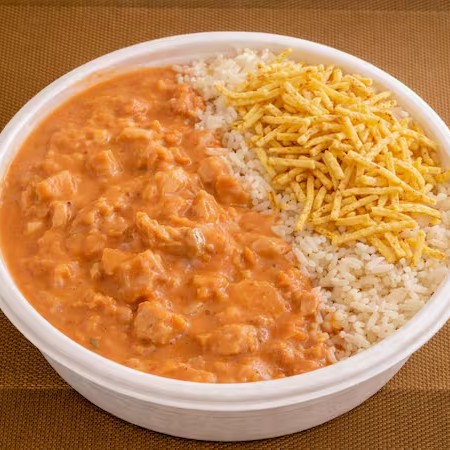 Marmita de Strogonoff (estrogonofe) individual (arroz branco, Strogonoff / Estrogonofe e batata palha). Marmita indicada para 01 pessoa.