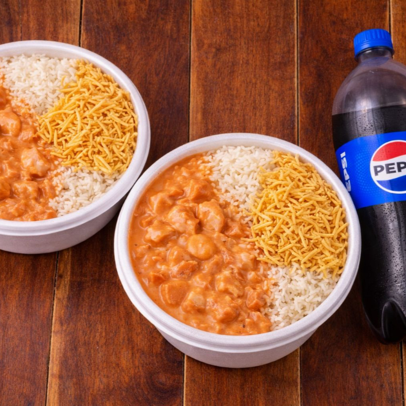 Marmita de Strogonoff (estrogonofe) individual (arroz branco, Strogonoff / Estrogonofe e batata palha) + Refrigerante 200ml conforme disponibilidade. Marmita indicada para 01 pessoa.