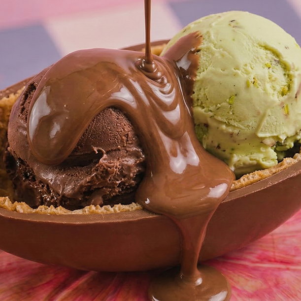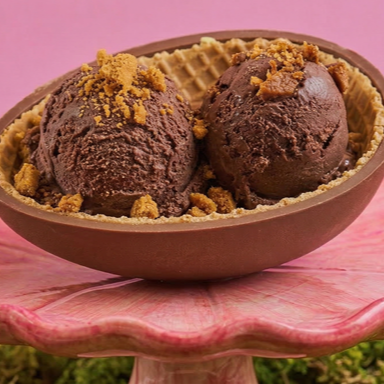 O encontro da suavidade do 4 Leites com a textura do Chocolate Crocante. Servidos numa casca de ovo de Páscoa feita com nossa casquinha artesanal e finalizados com creme de chocolate ao leite. O equilíbrio perfeito entre a delicadeza e a crocância em cada colherada.
