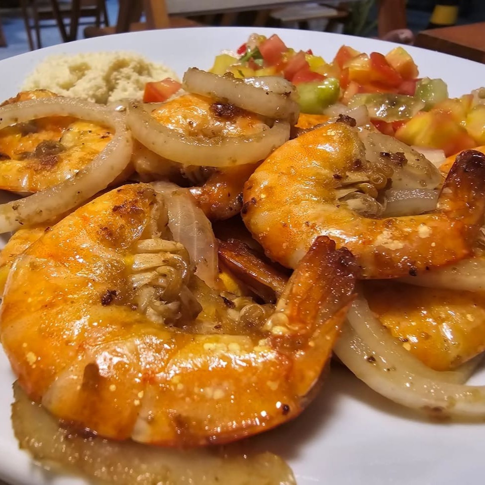 250g de Camarão ao alho e óleo, servido com arroz, feijão tropeiro e salada a vinagrete.