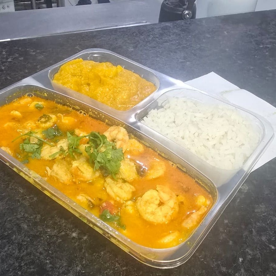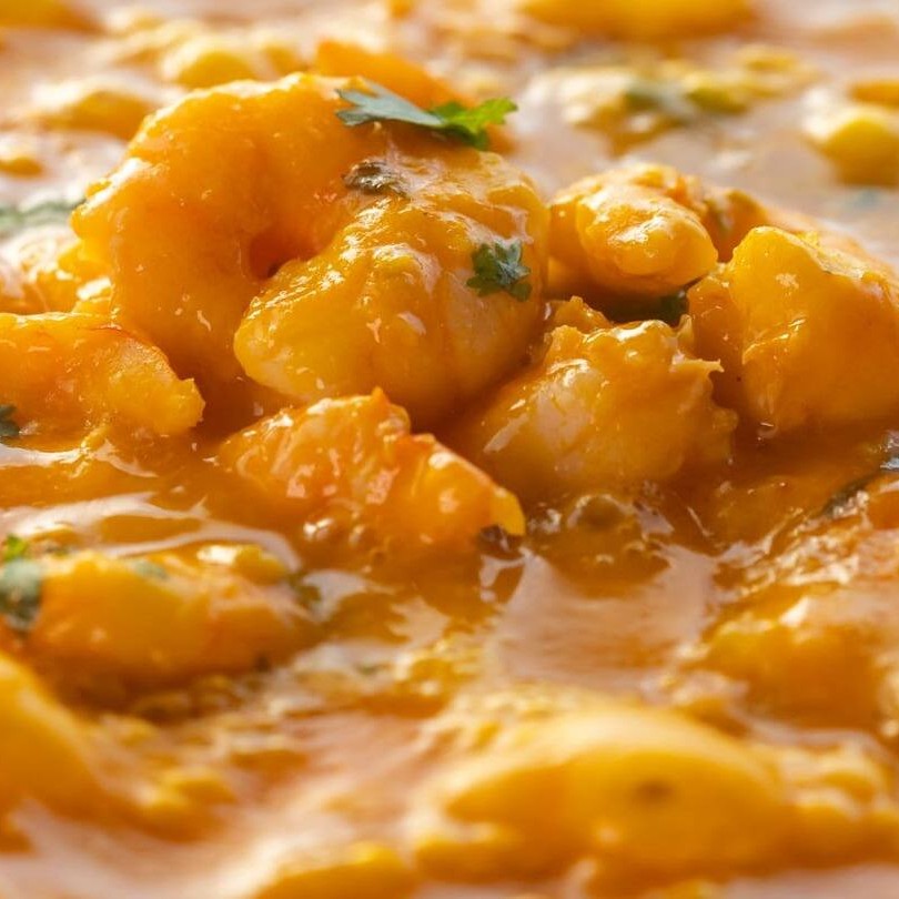 Deliciosa moqueca de camarão, servido com pirão cremoso, arroz soltinho e farofa crocante.