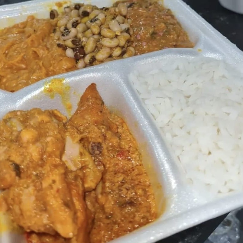 Uma combinação irresistível de vatapá, caruru, feijão fradinho, arroz e farofa.