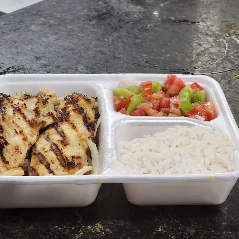 Peito de frango na chapa, acompanhada de arroz, feijão tropeiro e salada a vinagrete.