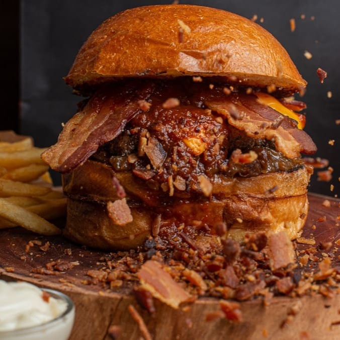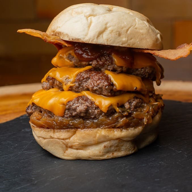 Delicie-se com o nosso 'Sweet Bacon Triplo', da categoria 'Smash'. Este prato apetitoso é feito com um suave pão brioche, que abriga um triplo smash burger de 60g, cada um coberto com uma generosa porção de queijo cheddar Inglês derretido. Acompanha cebola caramelizada, que adiciona um toque doce e levemente picante à combinação, e uma porção de bacon crocante, que adiciona a textura perfeita. Finalizado com um molho barbecue caseiro, que traz um sabor defumado e um toque de doçura, tornando este prato uma verdadeira explosão de sabores.