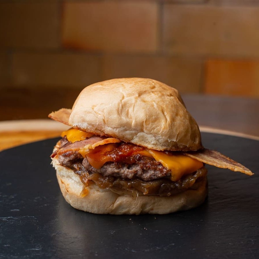 O Sweet Bacon é uma irresistível delícia da categoria 'Smash'. Este prato é composto por um pão brioche macio e levemente adocicado, abraçando um suculento smash burger de 60g. A carne, cuidadosamente preparada, é coberta com uma generosa camada de queijo cheddar Inglês derretido. A cebola caramelizada adiciona uma notas doces e complexas, enquanto o bacon crocante traz um toque de textura e sabor defumado ao conjunto. O molho barbecue finaliza o prato com seu sabor rico e levemente picante, criando uma experiência gastronômica inesquecível. É um hino ao sabor, à textura e à combinação harmoniosa de ingredientes de alta qualidade.
