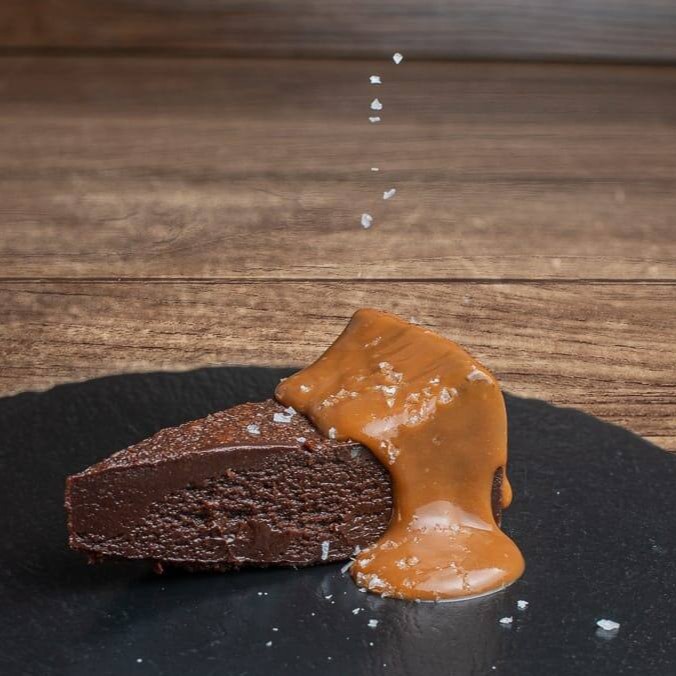 Bolo intenso de chocolate belga 70% com calda de caramelo salgado sem glúten.