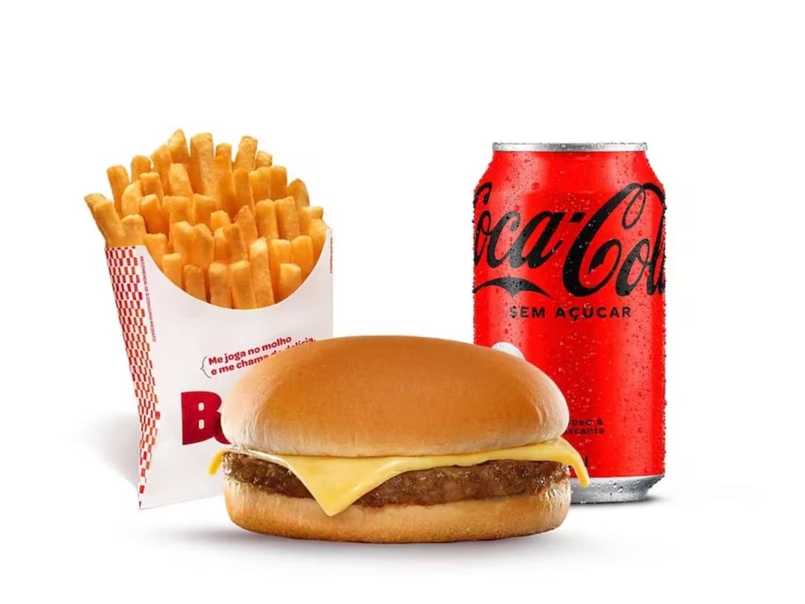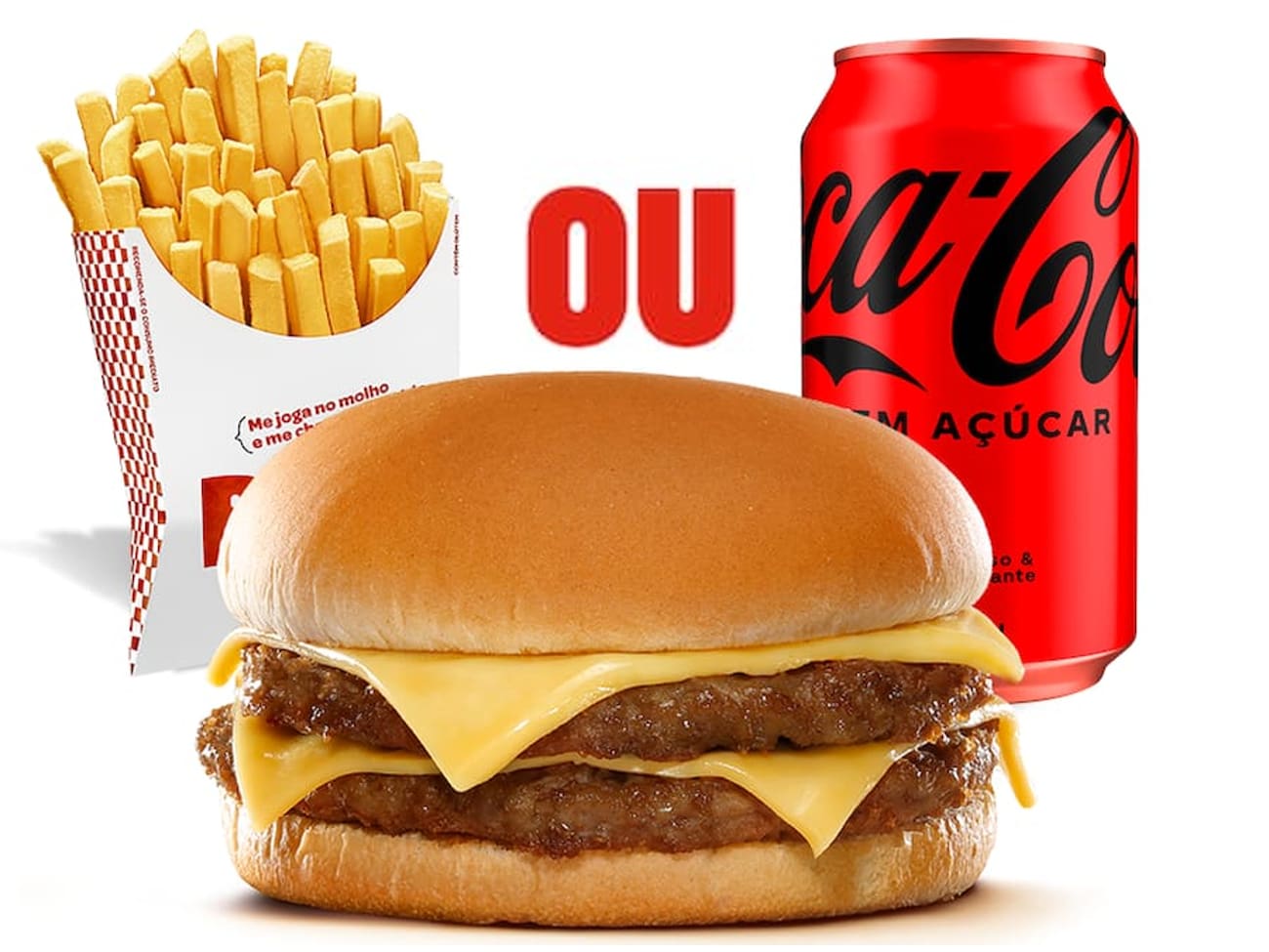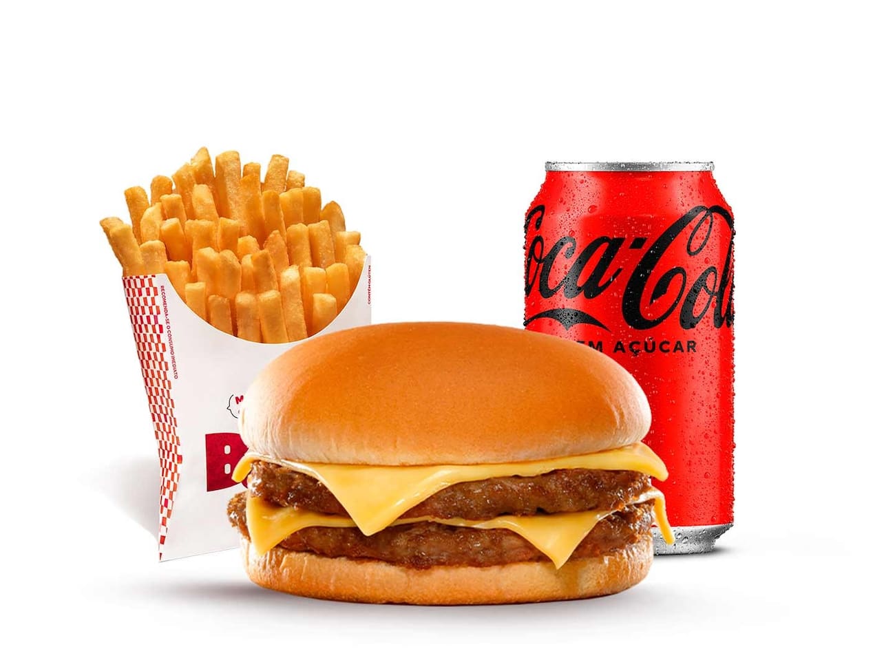 Clássico que todo mundo gosta: dois hambúrgueres bovinos com queijo num pão quentinho. Tudo isso acompanhado de refrigerante e batata quentinha.