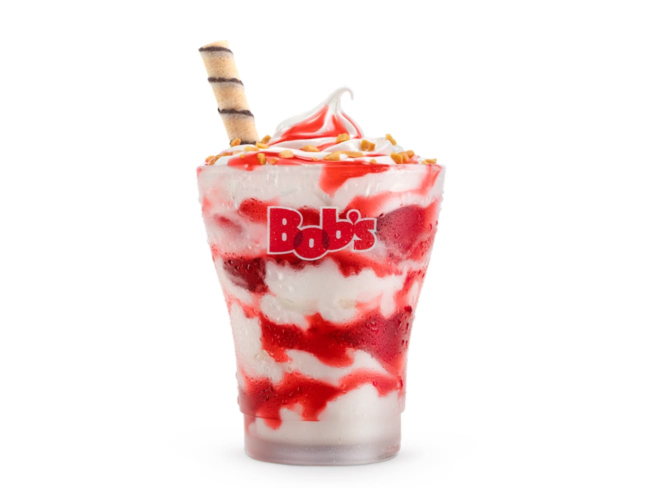 A combinação perfeita do nosso sorvete de baunilha e calda de morango com pedaços de verdade