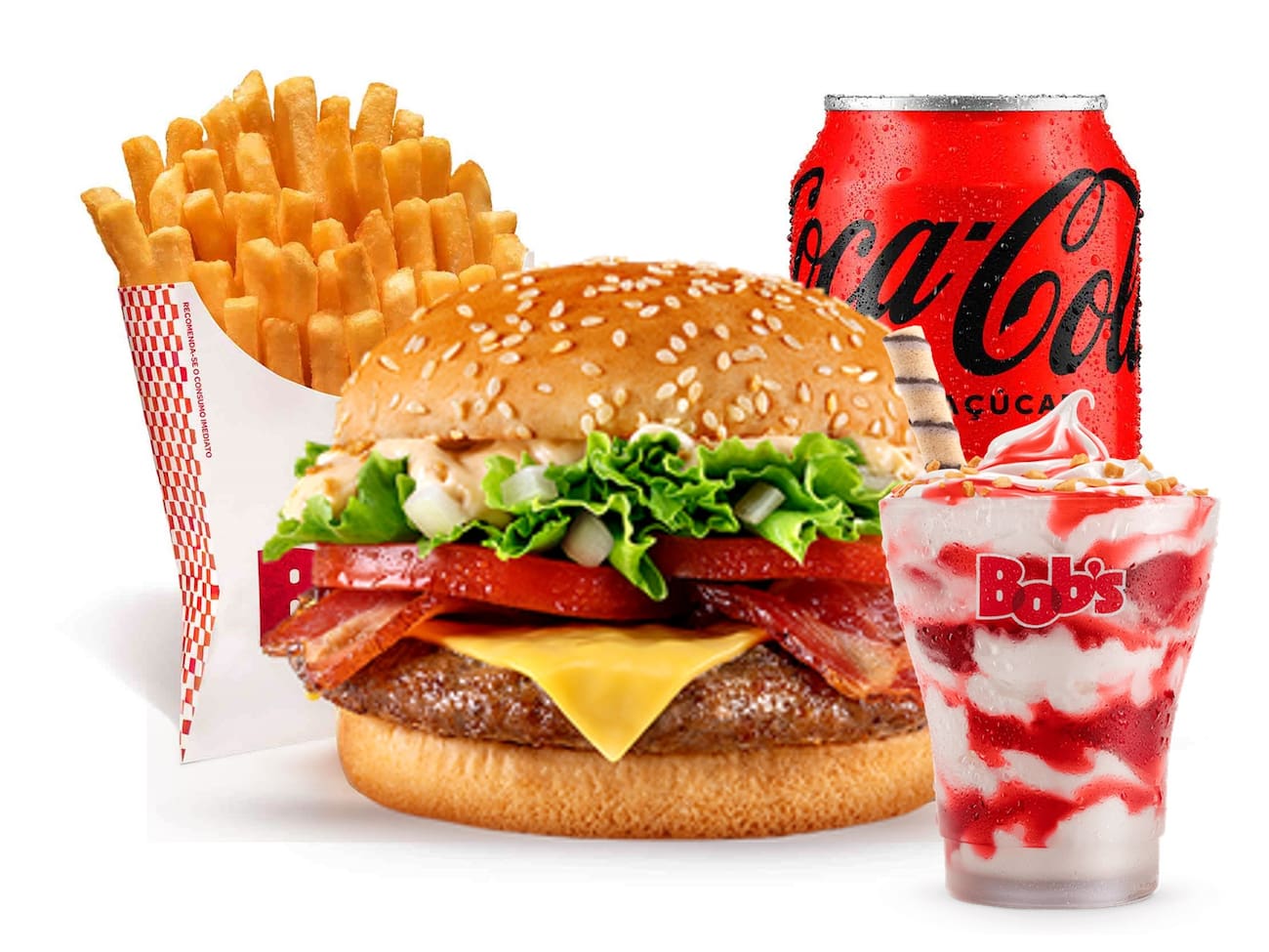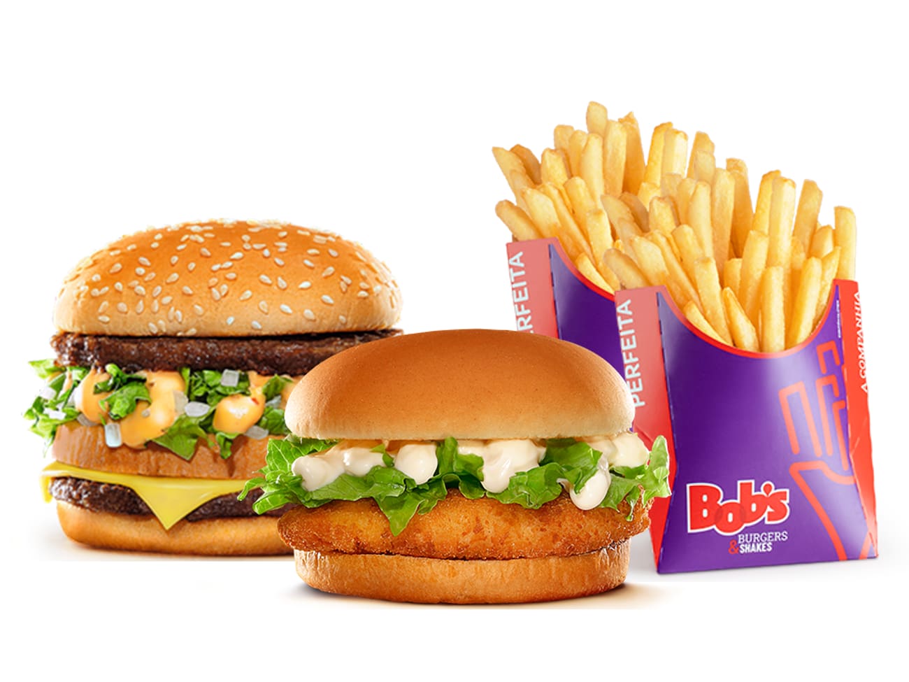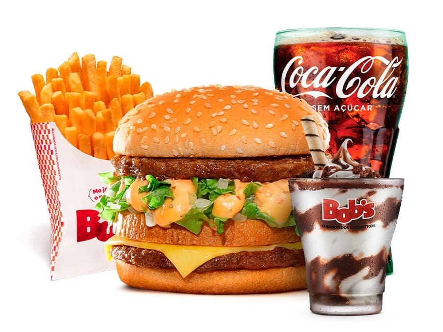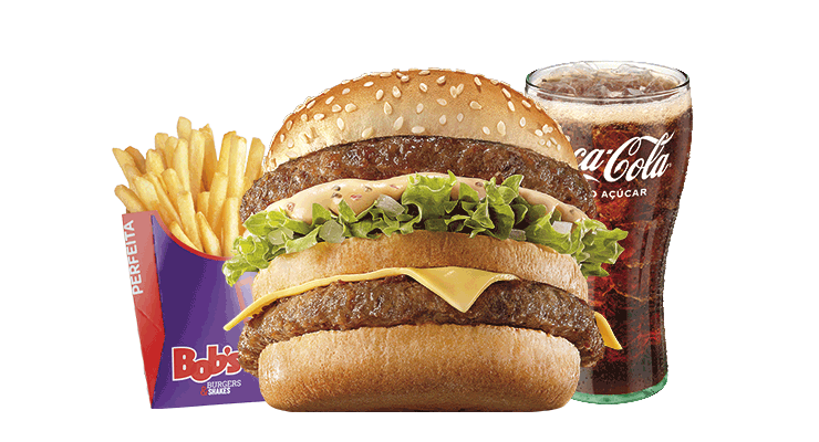 O trio é composto por um Big Bob (são dois hambúrgueres bovinos, queijo, alface e cebola fresquinhos e molho Big Bob Original, num pão quentinho com gergelim), uma porção média de batata palito e refrigerante.