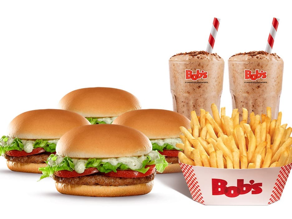 Combo perfeito para 2 pessoas compartilharem! Leve 4 Bob's Burguer acompanhado com 1 Batata Palito Mega e 2 Milk Shakes Clássicos à sua escolha.