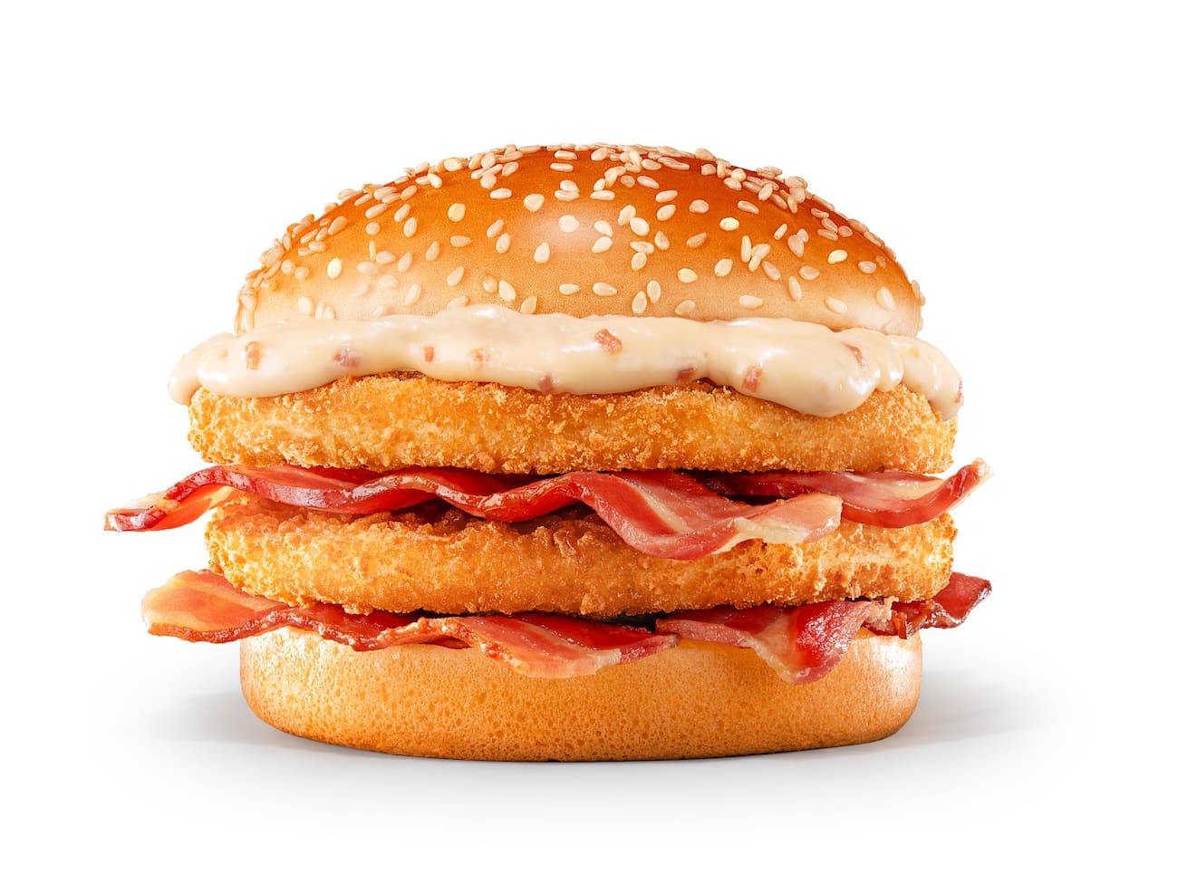 Dois suculentos empanados de frango Seara, super crocante, maionese sabor bacon, o dobro de fatias de bacon, em um pão brioche quentinho. Um baconzudo de responsa!