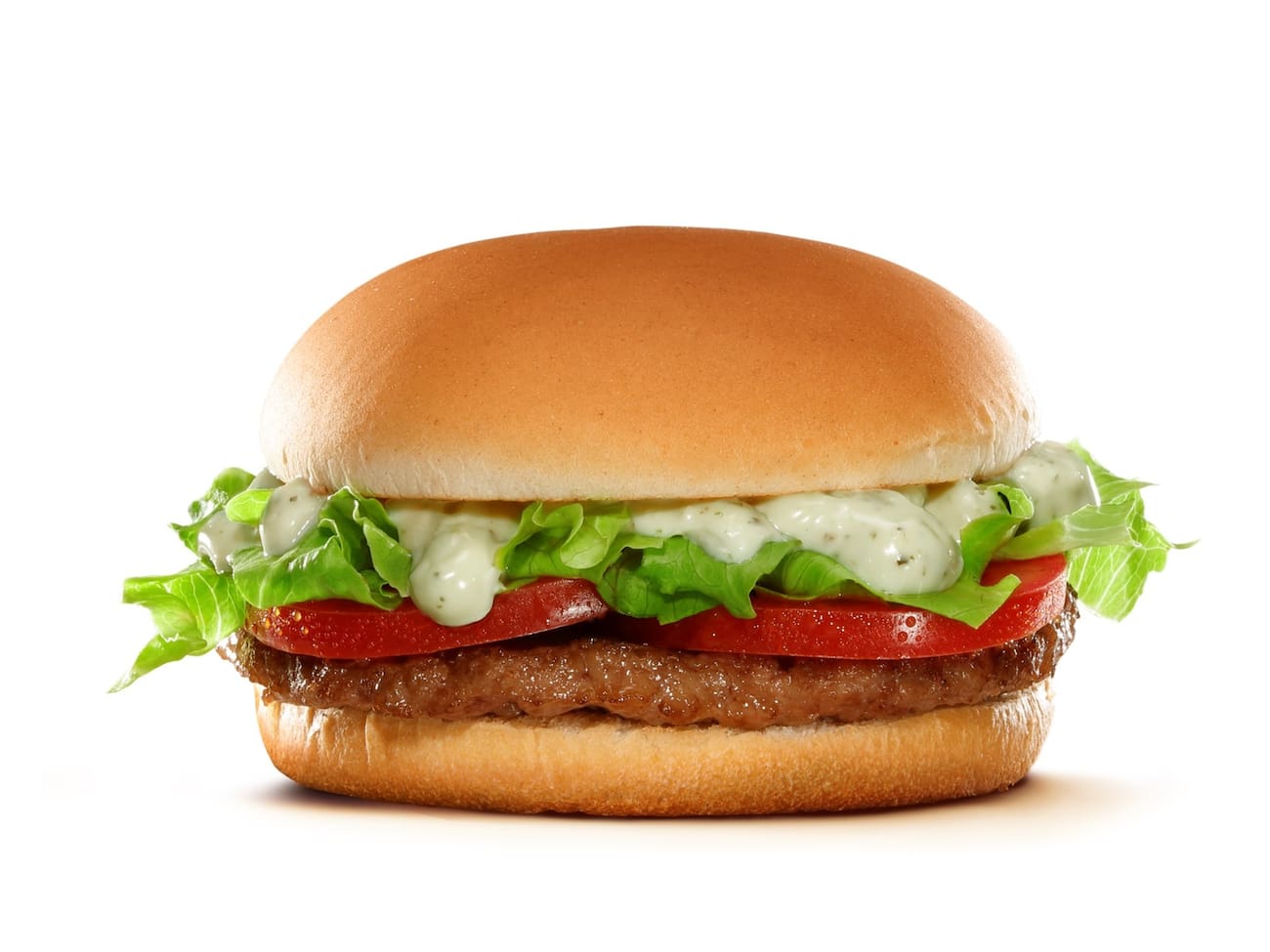 Pão quentinho, alface e tomate fresquinhos, hambúrguer bovino e maionese de ervas.