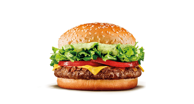 Hambúrguer suculento com cebola chapeada em cubos, queijo, alface e tomate fresquinho, deliciosa maionese verde em um pão de gergelim.