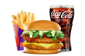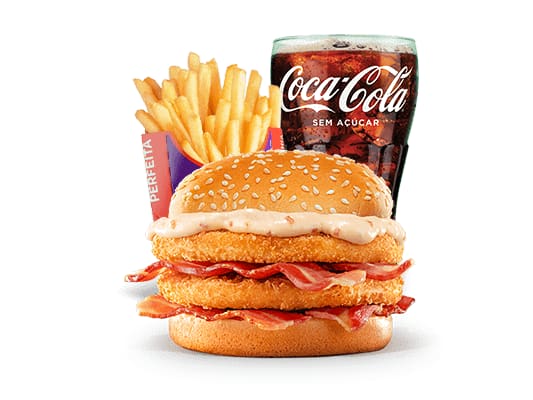 Feito com dois empanados de frango Seara super crocantes, queijo e bacon, acompanhados da nossa deliciosa maionese, no pão macio. Tudo isso acompanhado de refrigerante e batata quentinha.