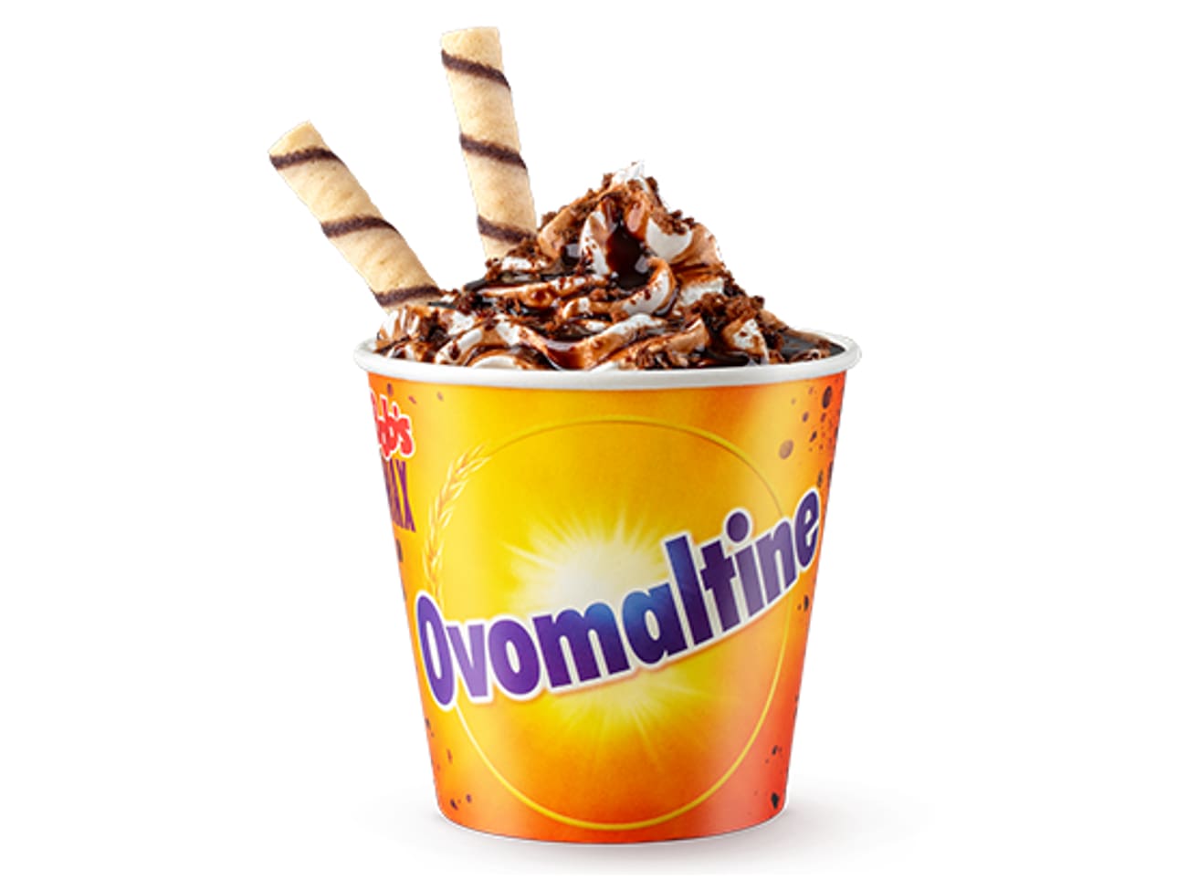 Sobremesa gelada de massa sabor baunilha com crocante Ovomaltine, calda de chocolate e dois tubetes.