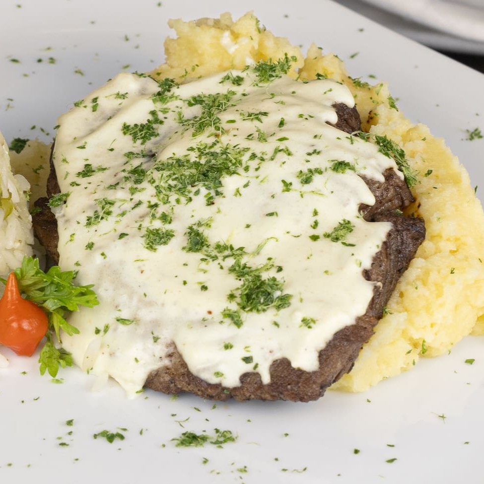Fillet ao molho 4 queijos e 2 acompanhamentos