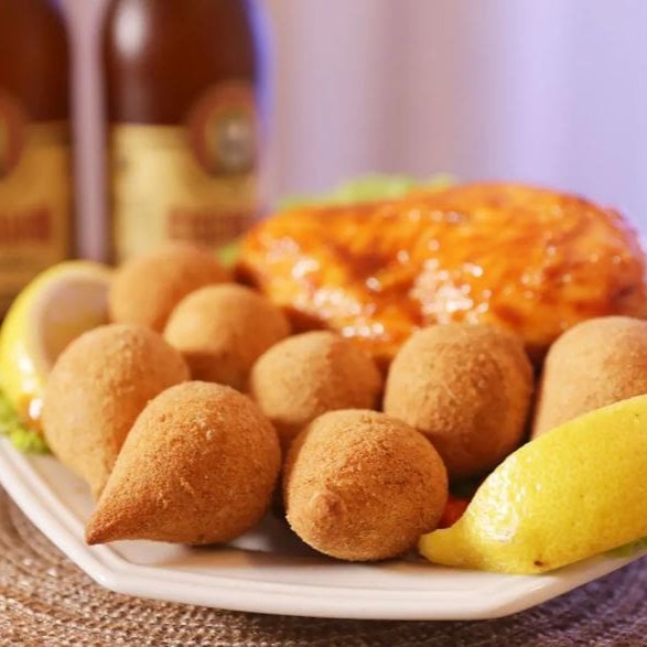 Porção com 8 bolinhos (30g cada), recheados com frango desfiado temperado e queijo mussarela, com massa leve e crocante.