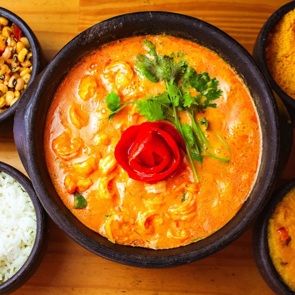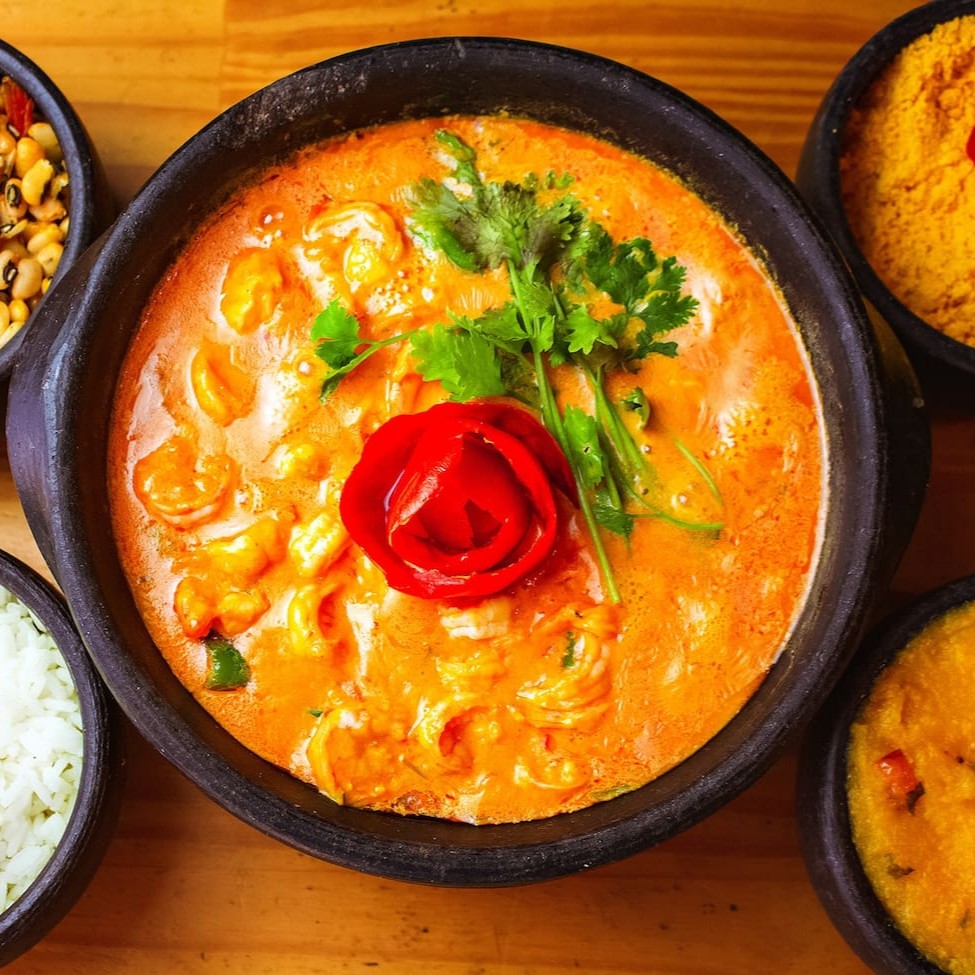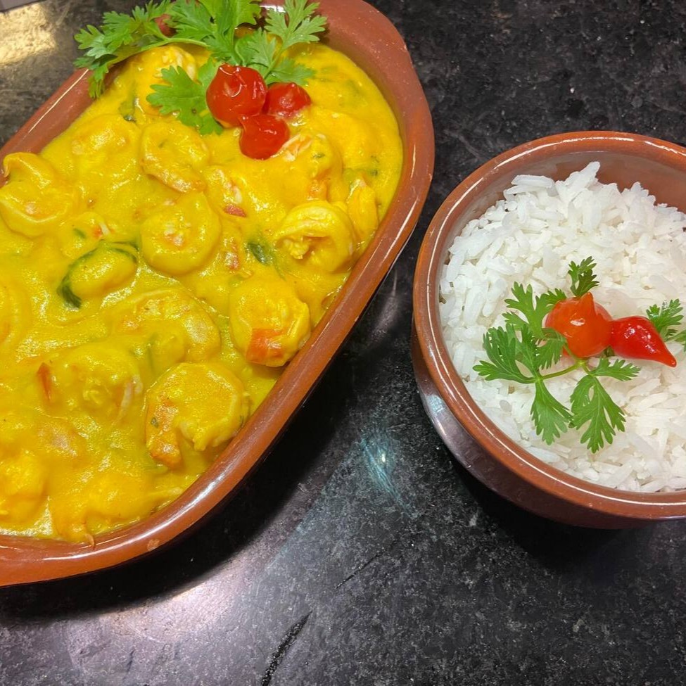 Moqueca com 300g de camarão, acompanhada de arroz branco (250g), feijão fradinho (250g), pirão (250g) e farofa (100g).
