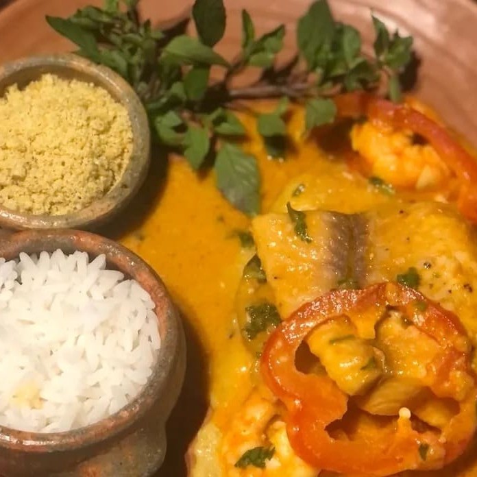 Moqueca com 300g de pescada, acompanhada de feijão fradinho (300g), arroz branco (250g), pirão (300g) e farofa de dendê (200g).