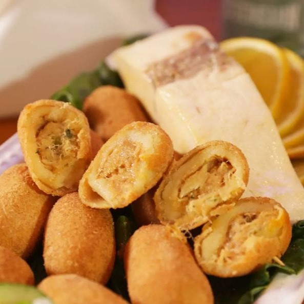 Porção com 8 bolinhos (30g cada), massa leve e crocante recheada com bacalhau desfiado temperado.