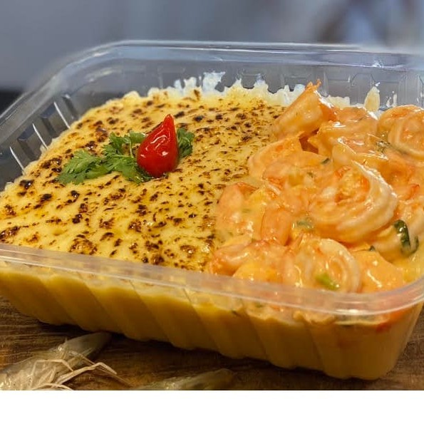 Pirão de aipim cremoso (500g) com 150g de camarão.