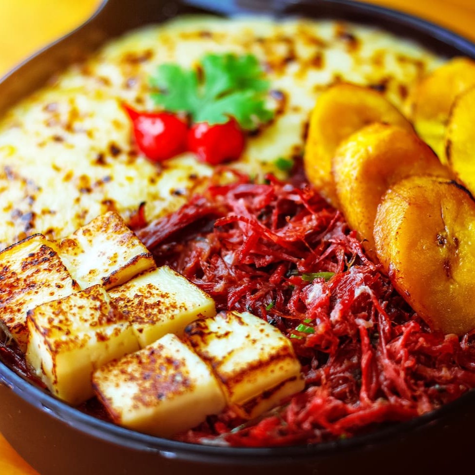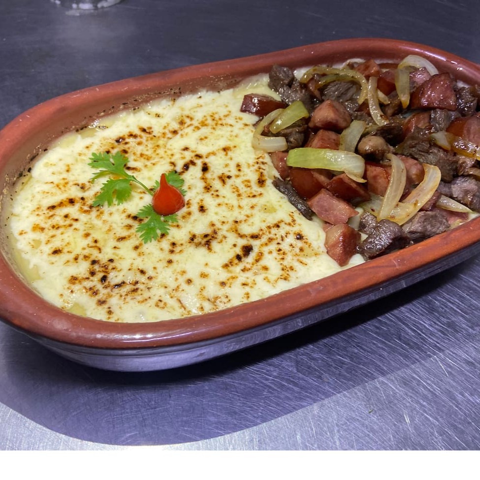 Pirão cremoso de aipim (500g), coberto com 170g de carne seca desfiada, cubos de queijo coalho e banana frita.