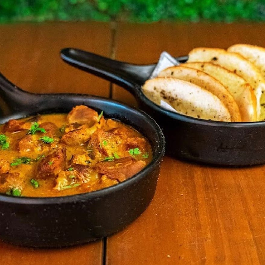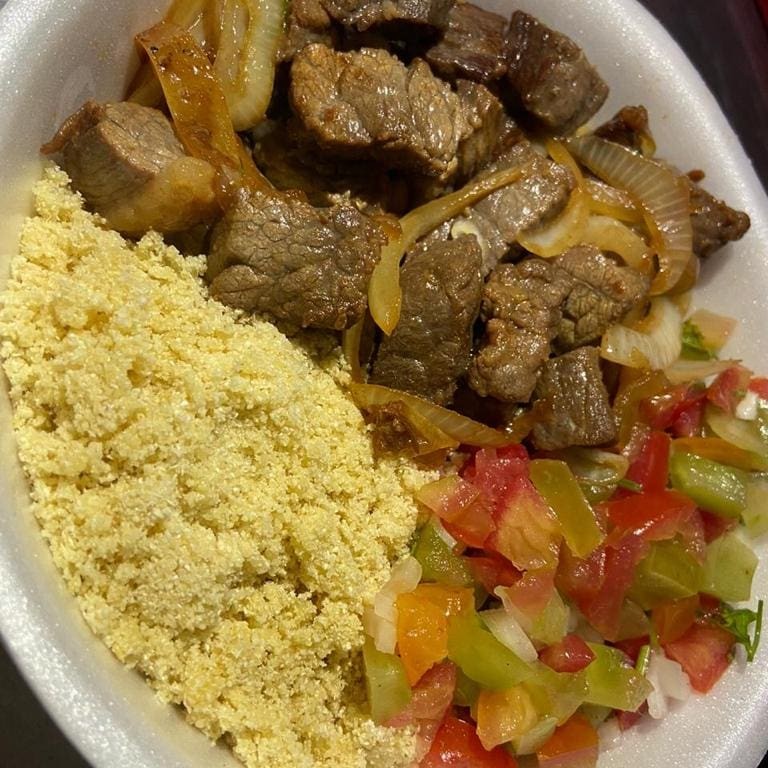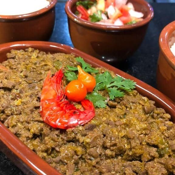 Xinxim com 350g de bofe cozido no tempero da casa, servido com arroz branco (200g), farofa temperada (200g) e salada vinagrete (200g).