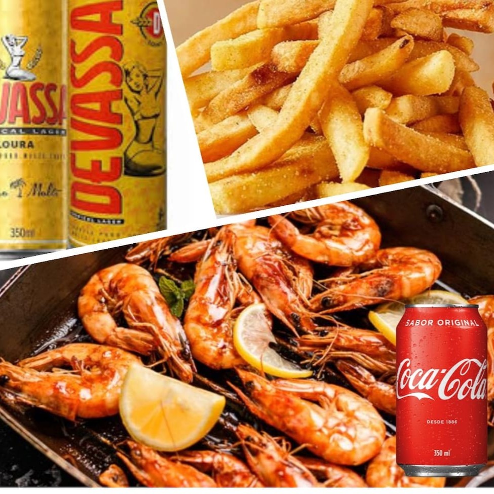 Camarão ao alho e óleo (300g) com batata frita (300g), acompanhado de 2 cervejas Devassa (350ml cada) e 1 refrigerante lata (350ml – Pepsi ou Antarctica).