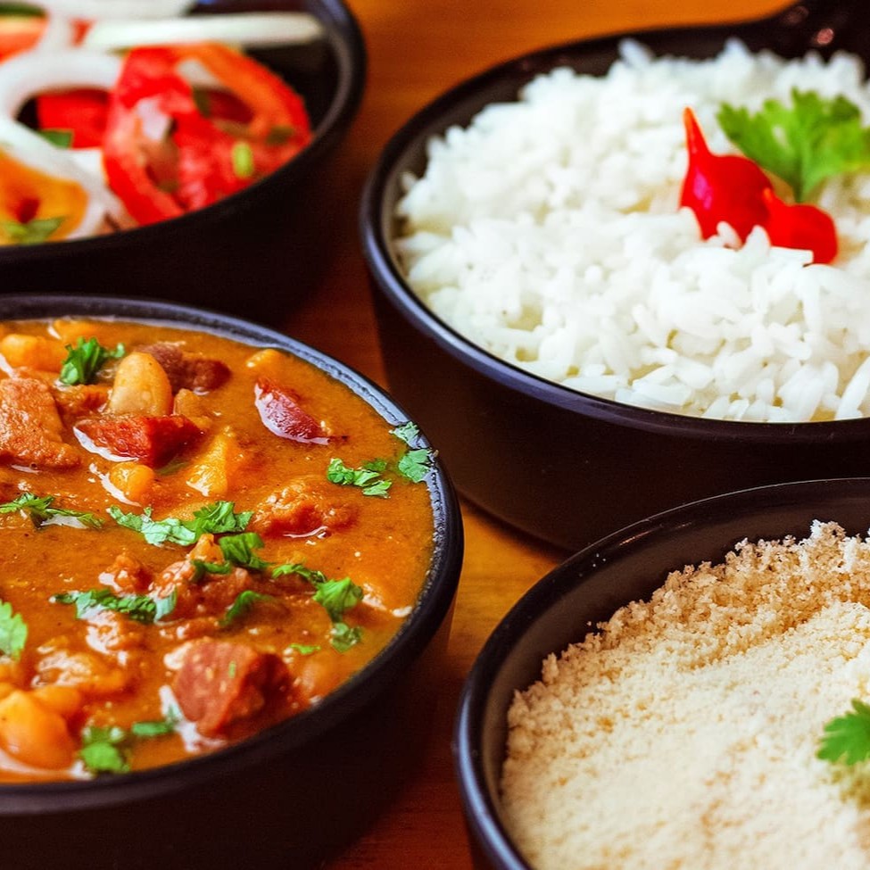 Moqueca com 300g de proteína (camarão e peixe), acompanhada de arroz branco (250g), feijão fradinho (250g), pirão (250g) e farofa (100g).