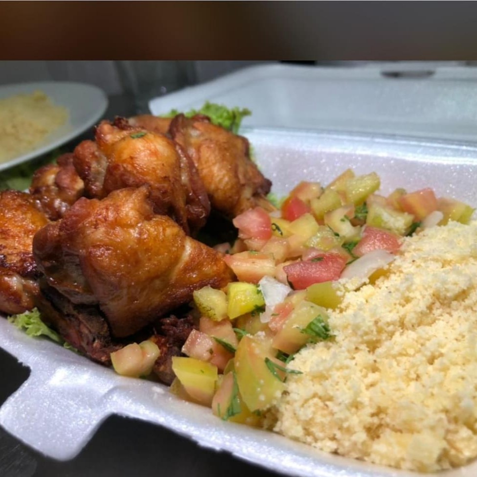 Frango a passarinho in natura (300g) grelhado, com farofa (200g) e salada (200g).