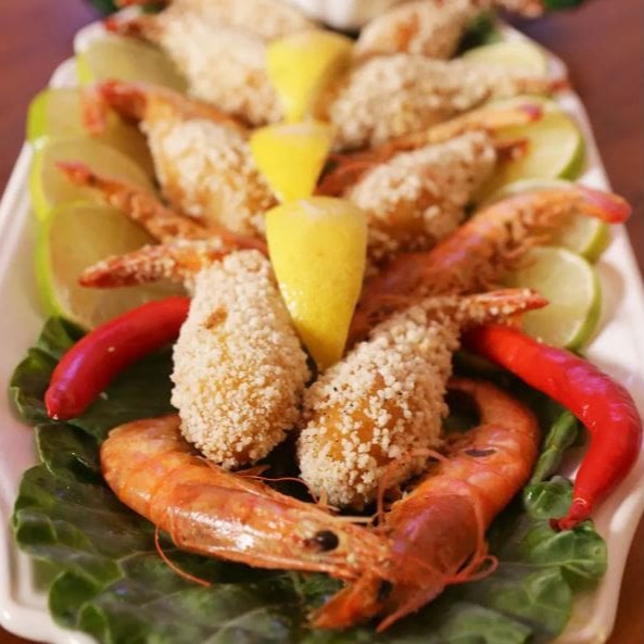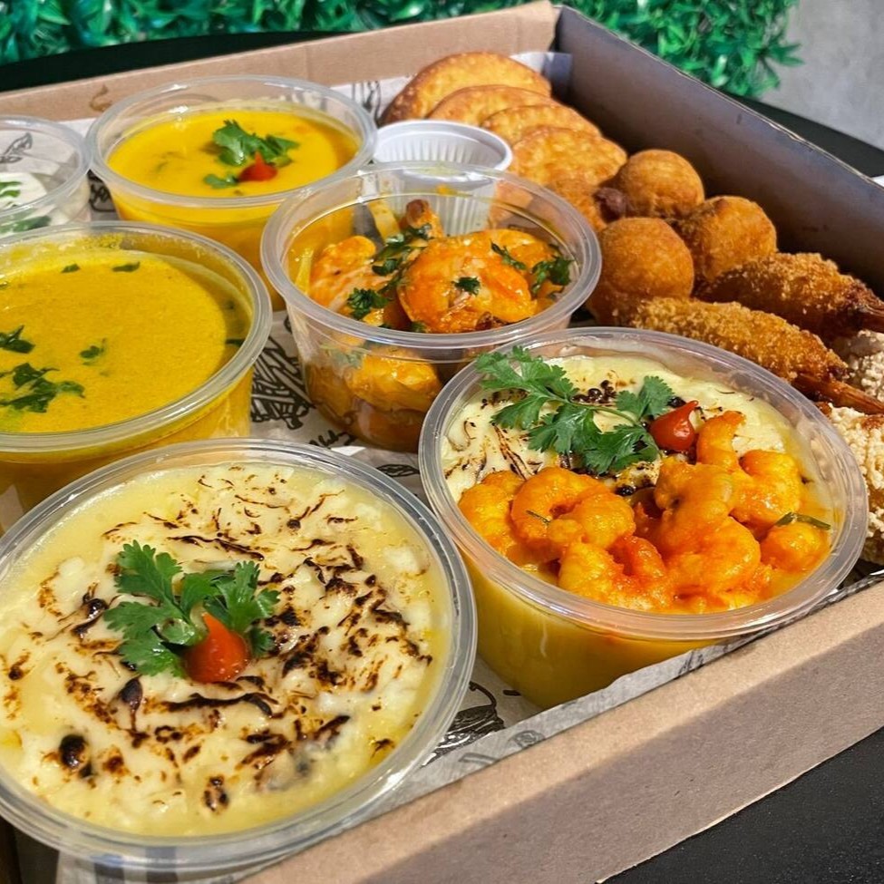 Seleção com 9 preparos diferentes de camarão: Camarão ao alho e óleo (100g) 2 camarões encapotados 4 camarões empanados 4 pastéis de camarão 4 bolinhos de camarão Caldo de camarão Bobó de camarão Pirão de aipim com camarão Escondidinho de camarão