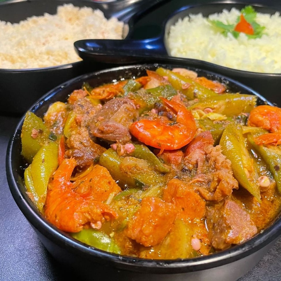 Quiabada com proteína ao molho, servida com arroz e farofa (escolha entre farofa de bacon ou farofa de dendê). Opções de porção para 1 pessoa ou 2 pessoas.