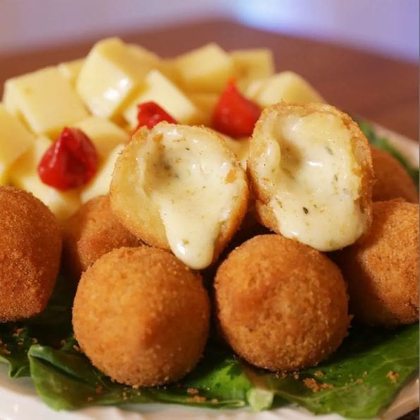 Porção com 8 bolinhos (30g cada), recheados com queijo mussarela derretido, com massa leve e crocante.