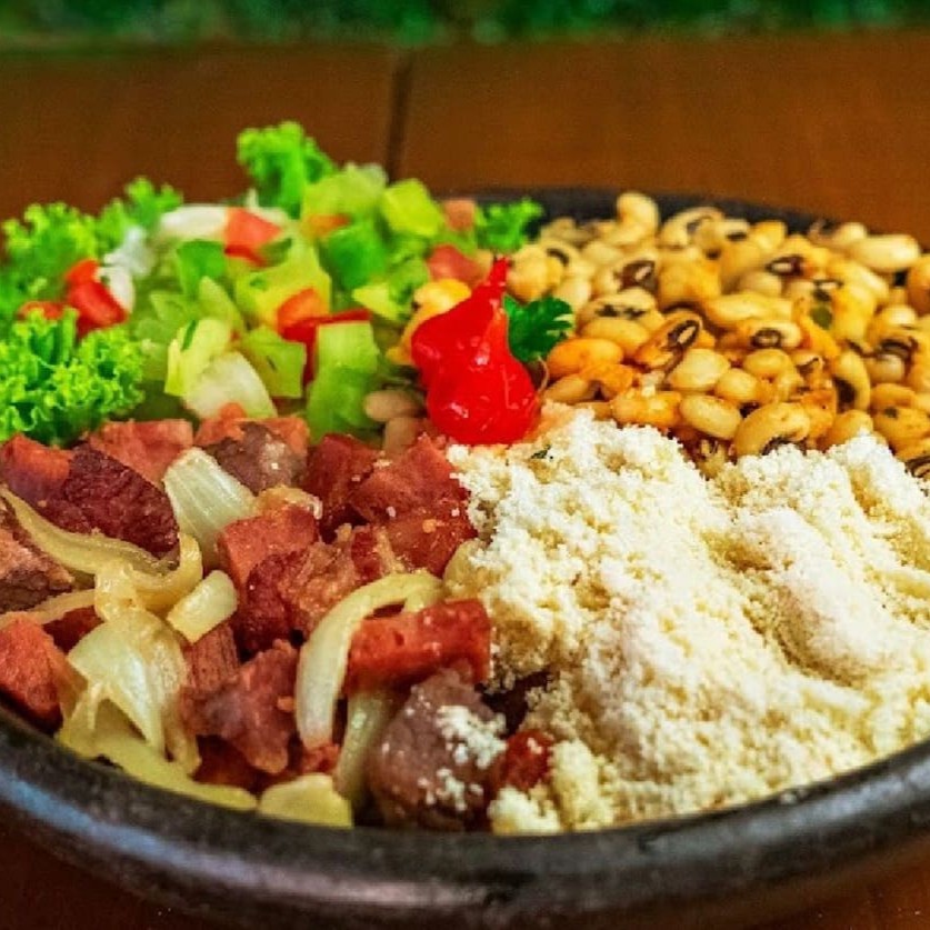 Feijão fradinho (100g), farofa (100g), salada vinagrete (100g) e 150g de proteínas variadas: carne de sol, charque e calabresa. Acompanha 4 latas de cerveja Devassa (350ml cada).