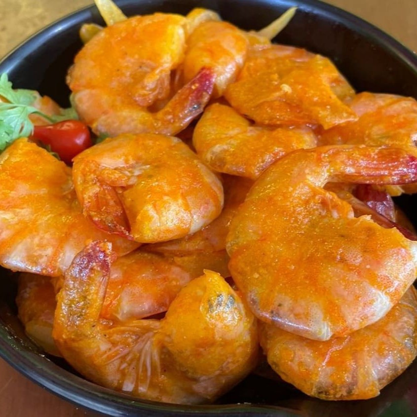 Porção com 300g de camarões salteados em óleo com alho, finalizados com leve toque aromático. Preparação simples e direta, com foco no sabor natural do camarão.