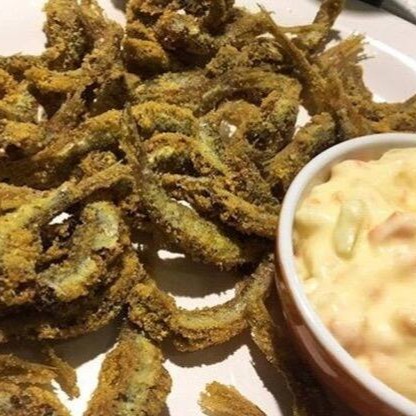 Pititinga frita (300g), com casquinha crocante e coberta por molho rosê cremoso.